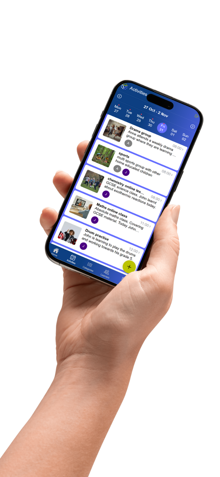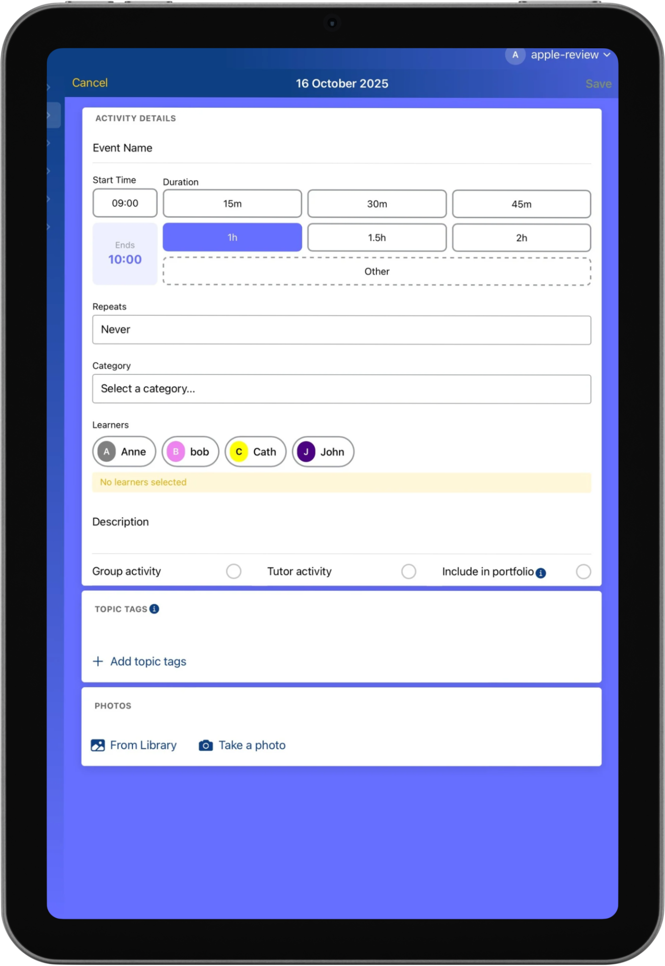 Learning takes place in many ways - it might be a lesson, a conversation, an excursion, a group or a self-led project. Add notes and photos. Assign an activity to one or more learners. Assign to a personalised category. Highlight a group activity or a tutor session. Add topic tags to create further detail.