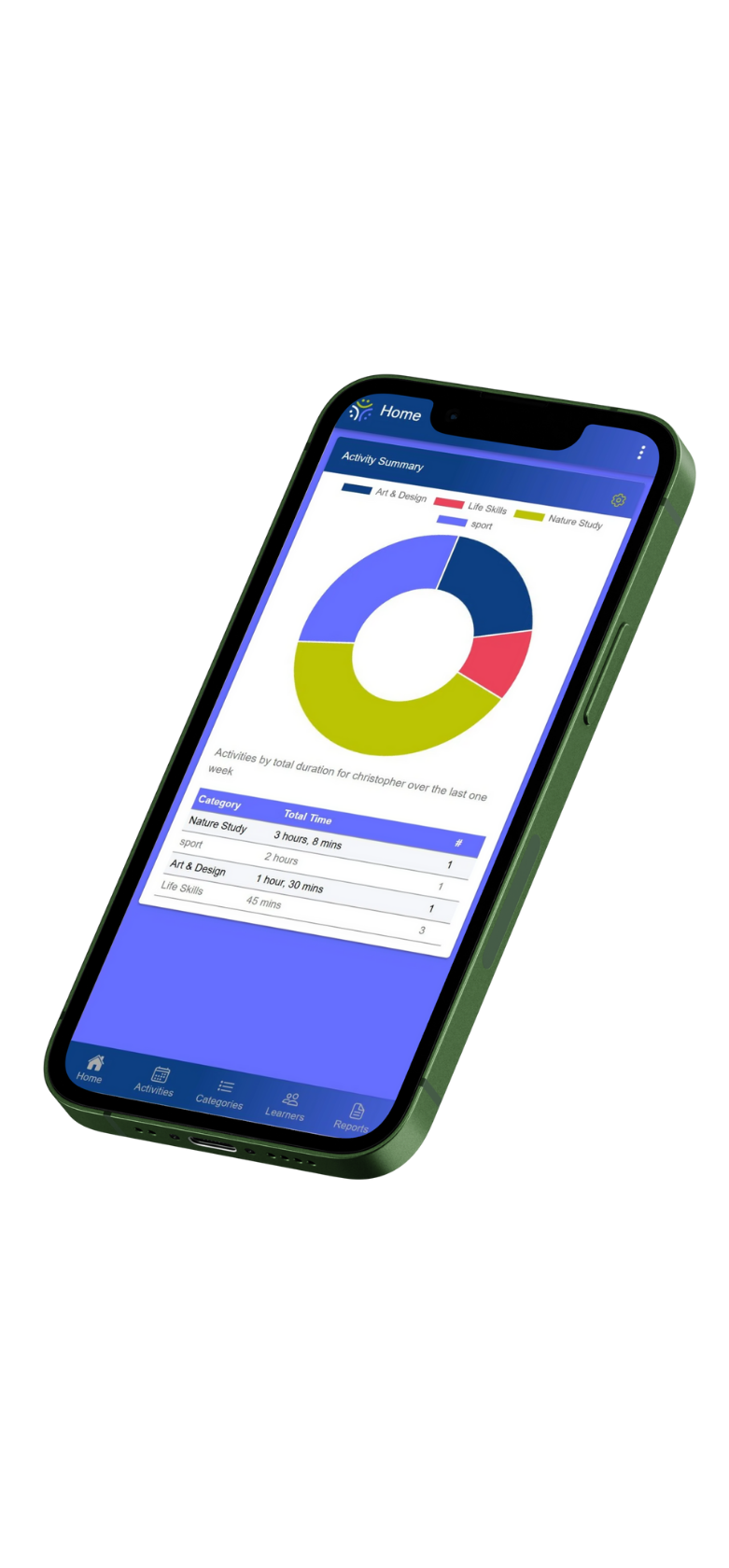 With personalised categories, view progress per learner and per category for a week, a month or more.